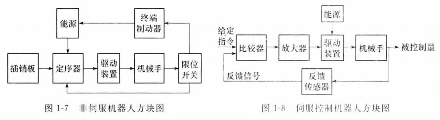 伺服控制機(jī)器人(servo-controlled robot)比非伺服機(jī)器人有更強(qiáng)的工作能力,因而價(jià)格較貴,但在某些情況下不如簡(jiǎn)單的機(jī)器人可靠。圖1-8表示伺服控制機(jī)器人的方塊圖。 伺服系統(tǒng)的被控制量(輸出)可為機(jī)器人端部執(zhí)行裝置(或工具)的位置、速度、加速度和力 等。通過反饋傳感器取得的反饋信號(hào)與來(lái)自給定裝置(如給定電位器)的綜合信號(hào),用比較器加以比較后,得到誤差信號(hào),經(jīng)過放大后用以激發(fā)機(jī)器人的驅(qū)動(dòng)裝置,進(jìn)而帶動(dòng)末端執(zhí) 行裝置以一定規(guī)律運(yùn)動(dòng),到達(dá)規(guī)定的位置或速度等。顯然,這就是一個(gè)反饋控制系統(tǒng)。