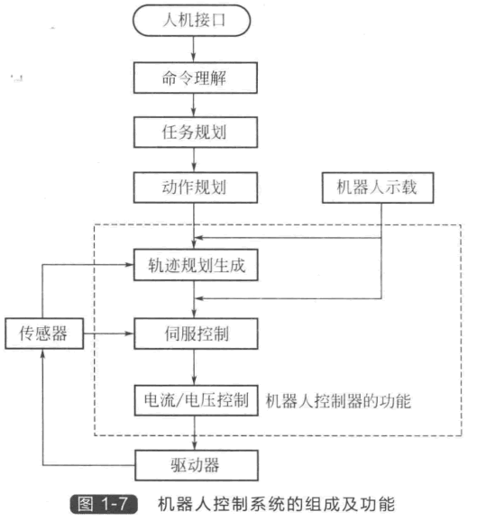 對于一個具有高度智能的機器人,它的控制系統(tǒng)實際上包含了“任務(wù)規(guī)劃” “動作規(guī)劃”“軌跡規(guī)劃”和基于模型的 “伺服控制”等多個層次,如圖1-7所示。 機器人先要通過人機接口獲取操作者的 指令,指令的形式可以是人的自然語言, 或者是由人發(fā)出的專用的指令語言,也可 以是通過示教工具輸入的示教指令,或者 鍵盤輸入的機器人指令語言以及計算機程